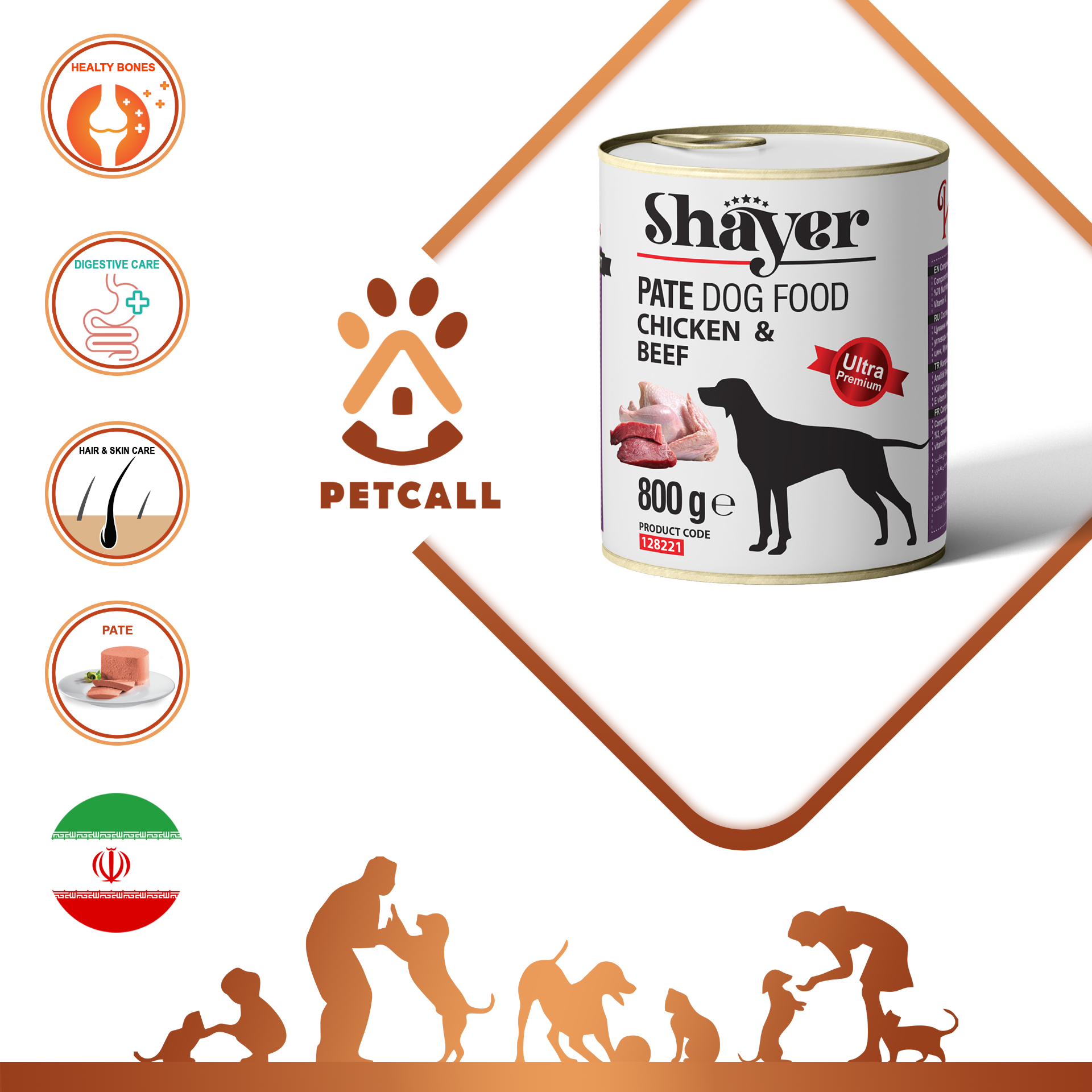 تهیه شده از گوشت گوساله ، گوشت مرغ ، جگر ، هویج ، سیب زمینی ، برنج ، نخود سبز ، استخوان.