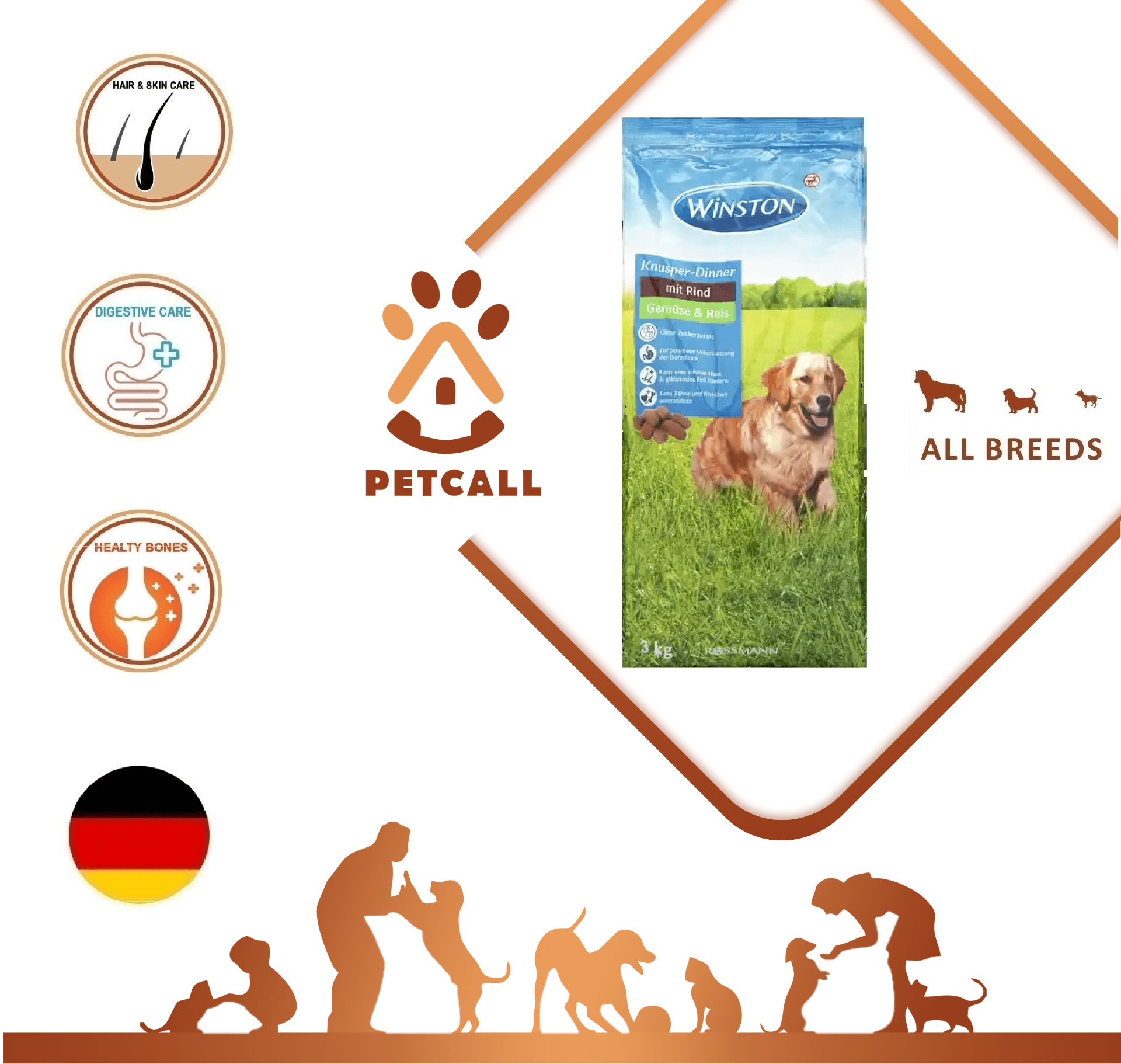 غذای وینستون تهیه شده با بهترین مواد اولیه طعم بسیار لذیذ گوشت گاو ، سبزیجات و برنج با هضم آسان به غذایی کامل تبدیل شده است ، دستور العمل این غذا غنی با اینولین است که تاثیر مثبتی بر فلور روده دارد و بیوتین و اسیدهای چرب امگا 3 و 6 باعث پوششی براق میشود ، همچنین ویتامین های موجود A و B و D3 و کلسیم و فسفر در ترکیبات این غذا باعث تقویت استخوان ، دندان و بینایی سگ ها میشود.